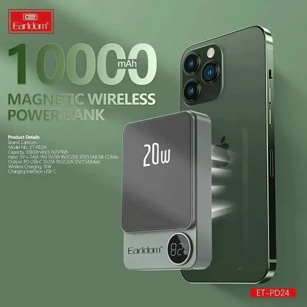این پاوربانک با پورت های خروجی ورودی و خروجی USB-C وایرلس، مناسب برای استفاده با دستگاه های MagSafe اپل می باشد. این به شما این امکان را می دهد که دستگاه های آیفون با فناوری MagSafe را به سرعت و بدون هیچ گونه مشکلی شارژ کنید. در مجموع، پاوربانک EARLDOM ET-PD24 با پورت های ورودی و خروجی متعدد و ظرفیت باتری مناسب، یک انتخاب عالی برای دارندگان آیفون های سری 12 به بالا و سایر دستگاه های اپل و همچنین دستگاه های سامسونگ سری S را می تواند شارژ نماید. این پاوربانک به شما این امکان را می دهد که دستگاه های خود را با سرعت بیشتری شارژ کنید و به راحتی از شارژ بیسیم نیز استفاده کنید.