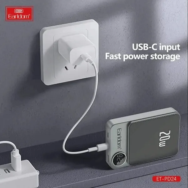 پاوربانک ارلدام ET-PD24 با پورت USB-C و پشتیبانی از تکنولوژی Power Delivery (PD) به شما این امکان را می دهد که دستگاه های سازگار را به سرعت بیشتری شارژ کنید. این تکنولوژی به شما این امکان را می دهد که در کمترین زمان ممکن باتری دستگاه های خود را شارژ کنید.